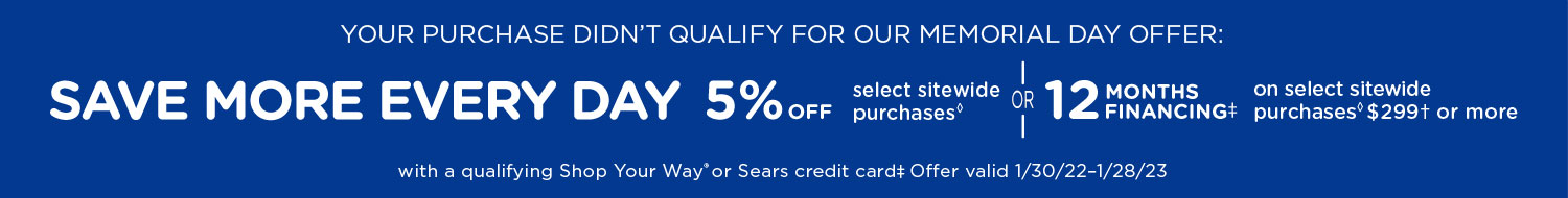 †Purchase requirement less coupons, discounts does not include tax, installation, shipping or fees, and must be made in single transaction. For online transactions you must select the Savings offer on the payment page in checkout. See store or sears.com for details.